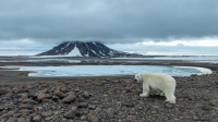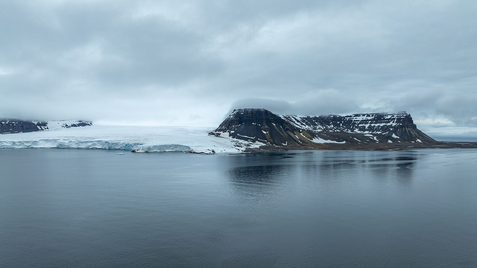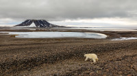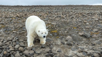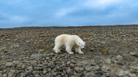 В 13 часов 3 минуты, в тот момент когда мы делаем квадрокоптером общее фото, прямо напротив нас со снежника в 400 метрах поднимается здоровый белый медведь и не теряя времени быстро идет в нашу сторону. Мы завершили съемку, поспешили сесть в лодку, покинули остров. Медведю оставили его домик "Эйры" и свежие стройматериалы. В следующем году, проверим, успела ли бригада белых мишек освоить весь стройматериал и выполнить ремонтный подряд.
