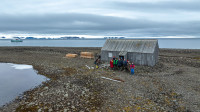 Работа началась 20 июля сразу после завтрака. Дедлайн был определен в 13:00. В это время все должны были вернутся на корабль. Сложности и увеличение объема работы конечно тоже были. Часть маршрута от берега до "Домика Эйры" - это был оттаявший снежный наст, в котором вязли ноги. А сам домик тоже потребовал к себе больше внимания - одну стенку стали разрушать белые медведи, пришлось заделывать образовавшуюся брешь, чтобы животные далее не проявляли любопытство. Часть крепежа для стяжки стен домика, оказалась не по размеру, пришлось играть в "ТРИЗ" и искать оперативное решение.