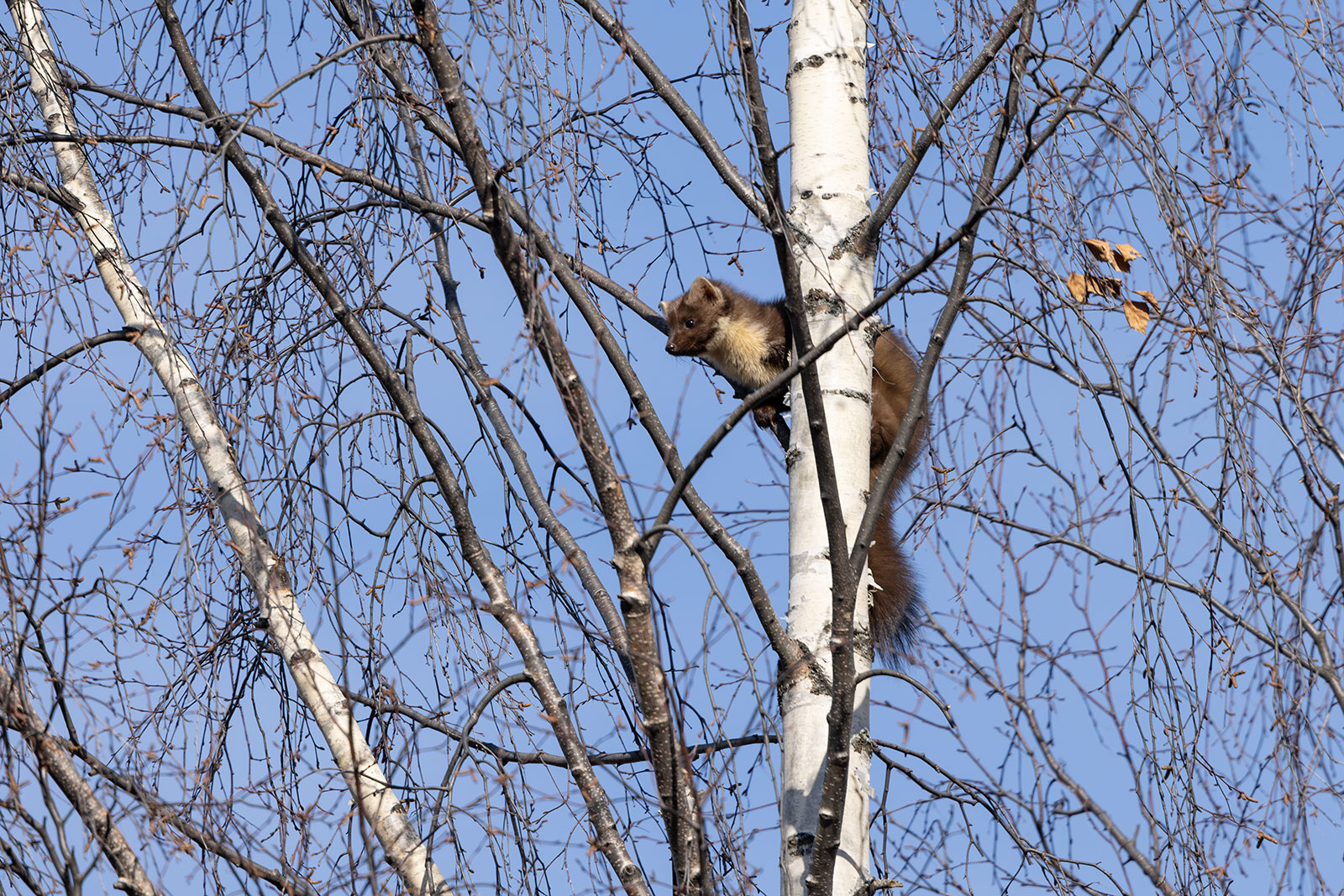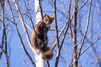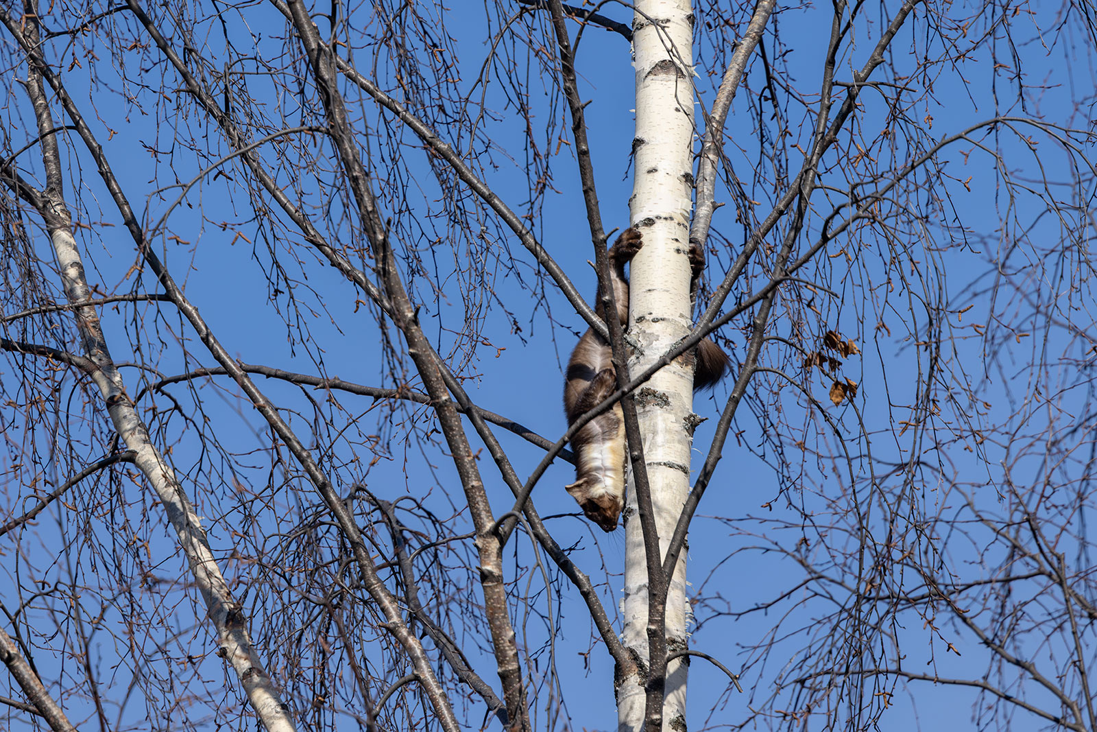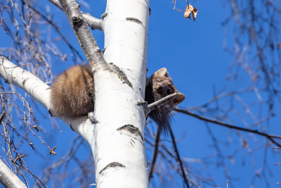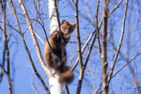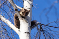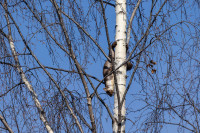 И тут горожане заметили куницу. Всем захотелось ее сфотографировать. Тянут свои смартфоны вверх, но не дотягиваются. Кто-то даже пытался на березу поближе забраться, но куница поднялась на самую макушку, так что с земли теперь было и не понять, что за зверь там сидит.