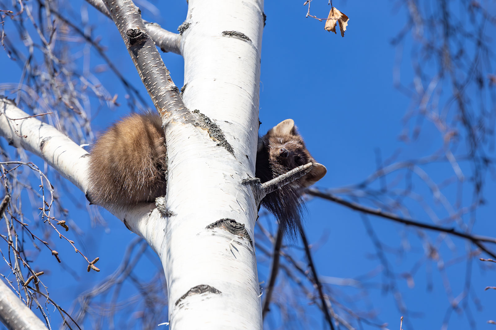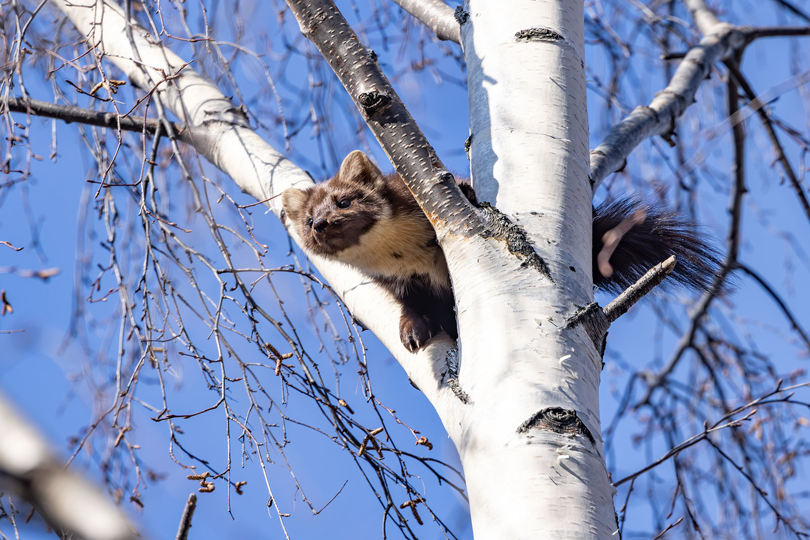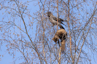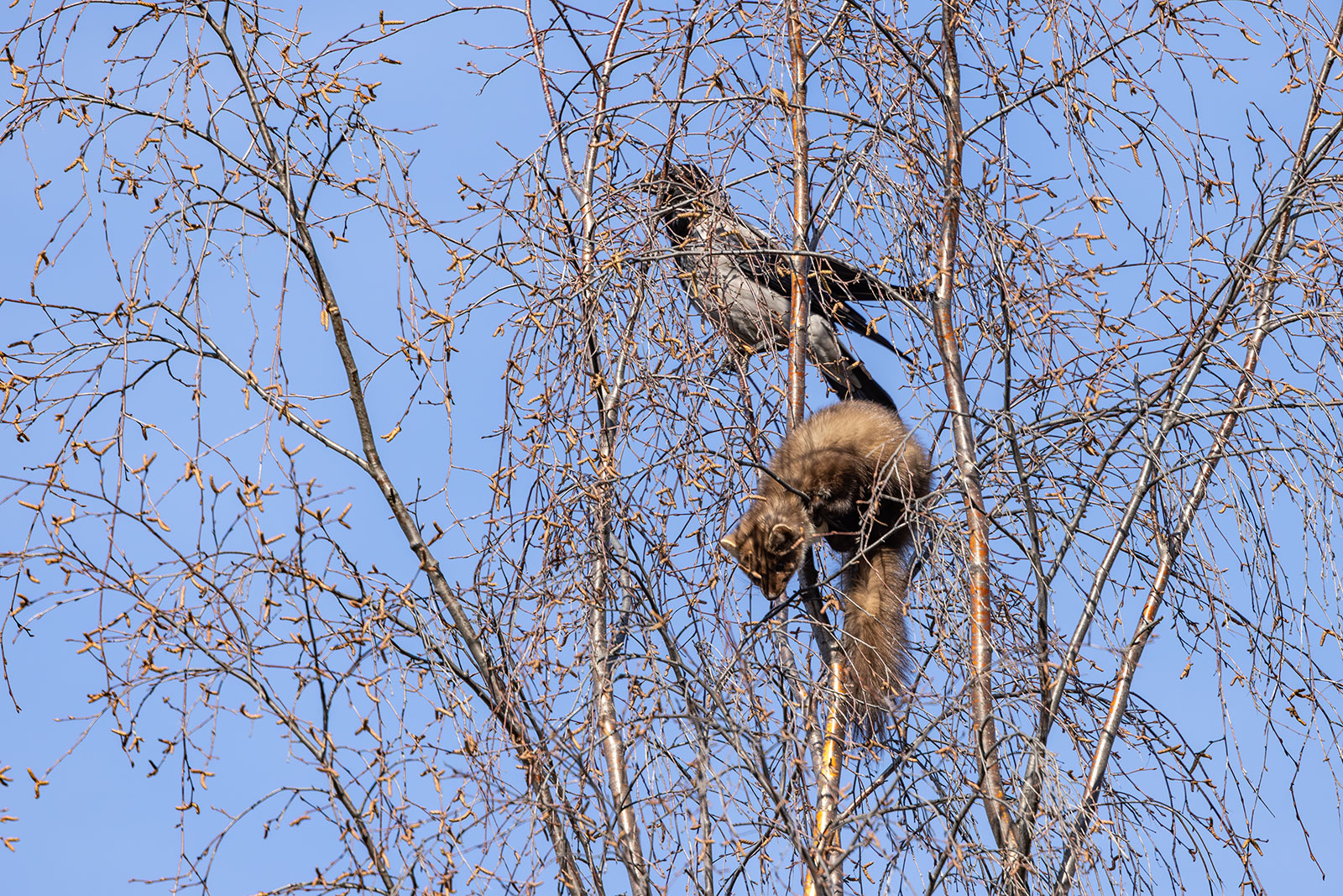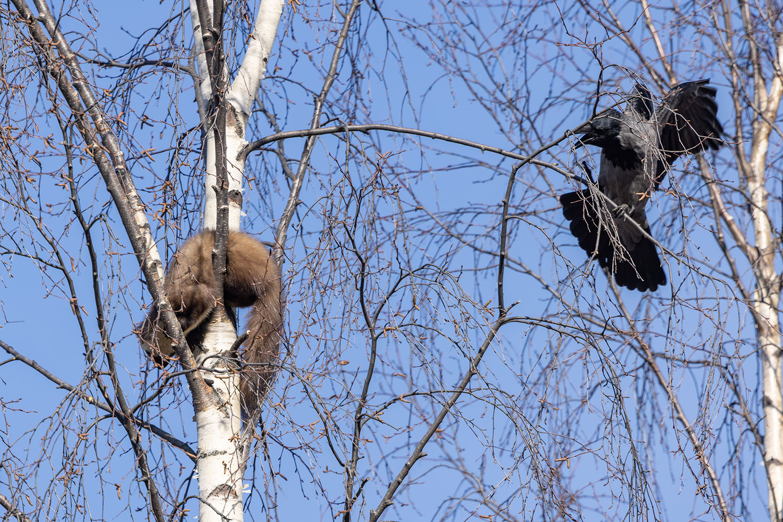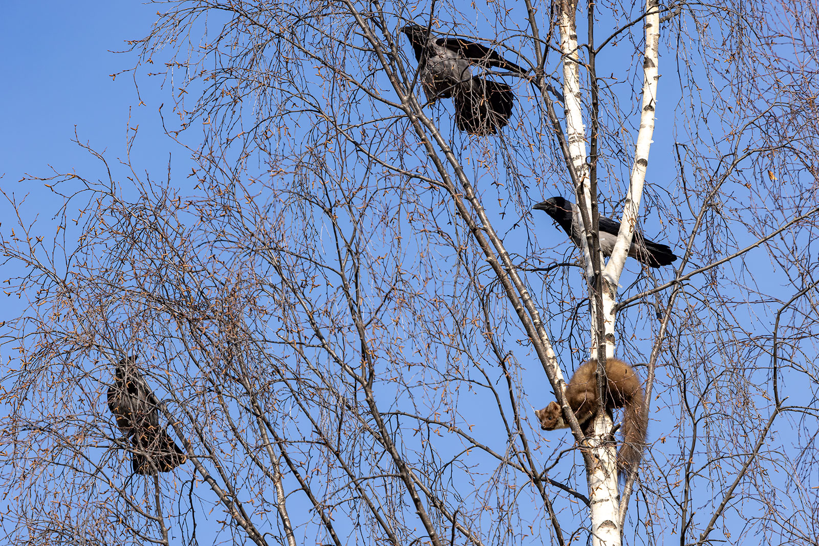 Куница дремала-дремала среди веток, но тут взошло аномально жаркое солнце марта. Стало припекать. Куница на ветке крутится, пытается мордочку в тень устроить, а спинку под солнышко. В этот момент ее и приметили настоящие хозяева «верхнего яруса» — вороны. Теперь было не до сна. Стаей до пятнадцати голов атаковали они гостью. Но всегда держались не ближе метра. Куница поняла, что эти надоеды не опасные. Нужно просто не обращать внимание. И воронам стало скучно. Они разлетелись. Раз в час самая настырная прилетит, карканьем скликает стаю на три головы, да тоже быстро по своим делам улетит.