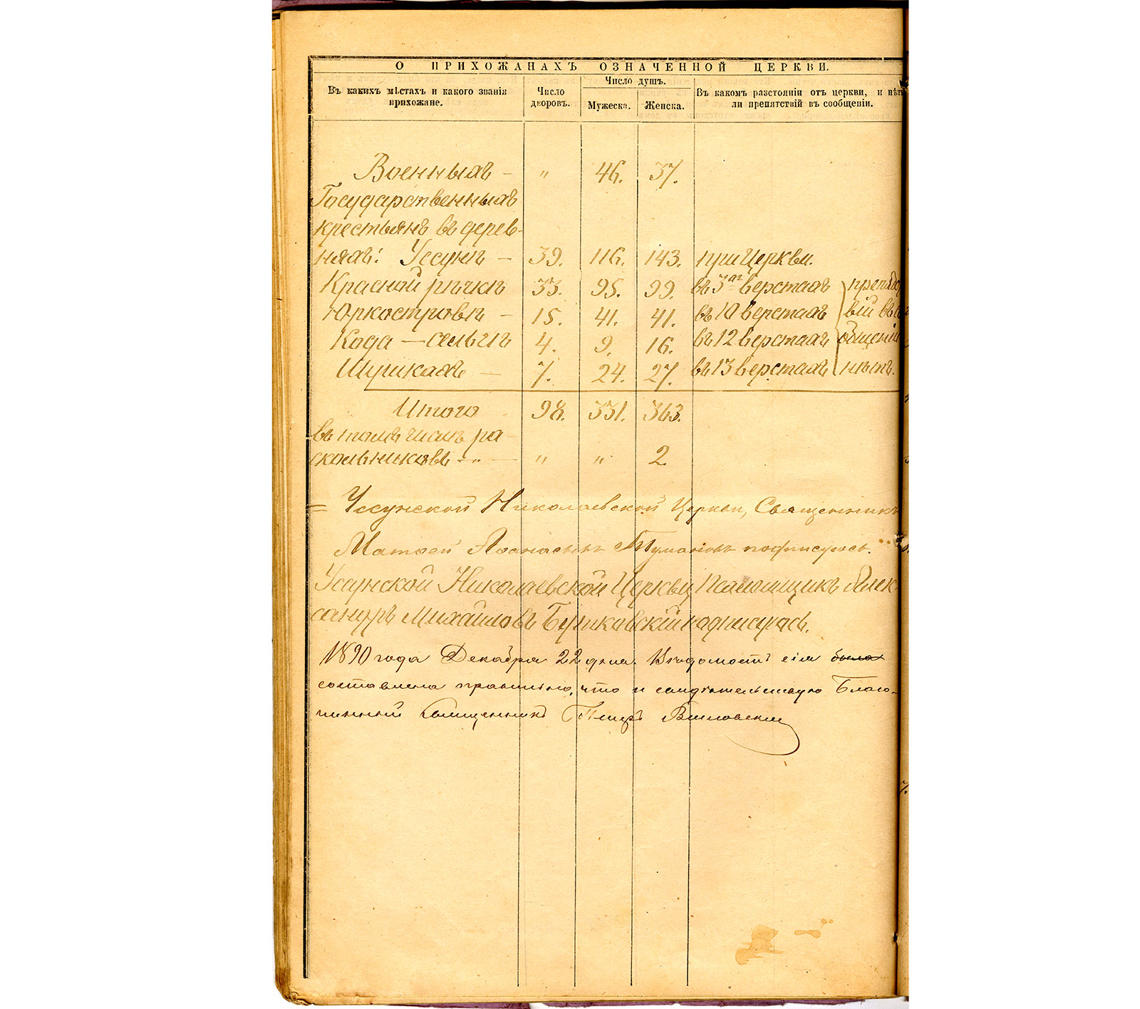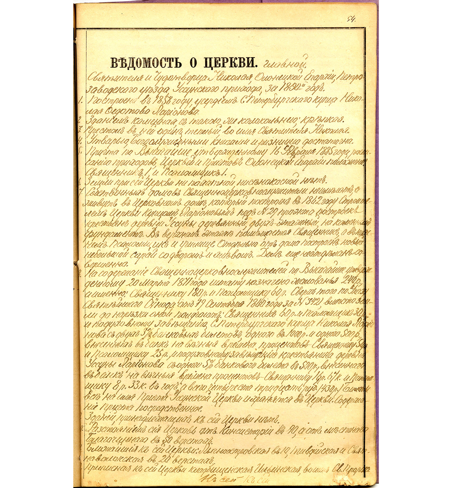 Стоит отметить, что в середине XIX века в Уссуне уже существовала деревянная Ильинская церковь, которая также была построена Ларионовыми, но современным и главным стал именно каменный Никольский храм. К этому храму были приписаны все окружные деревни и находившиеся в них часовни, о чём есть документ 1890 года — «Ведомость по Уссунскому приходу храма Святителя и Чудотворца Николая».