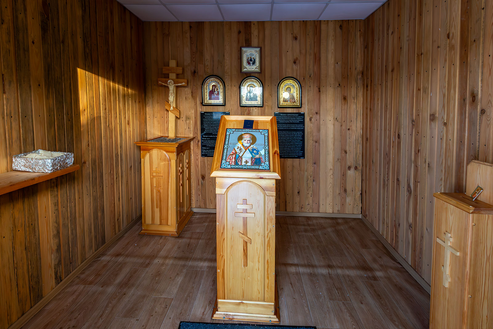Часовня расположена рядом с парковкой автозаправки и всегда открыта для всех, кому нужно уединённое место для молитвы.