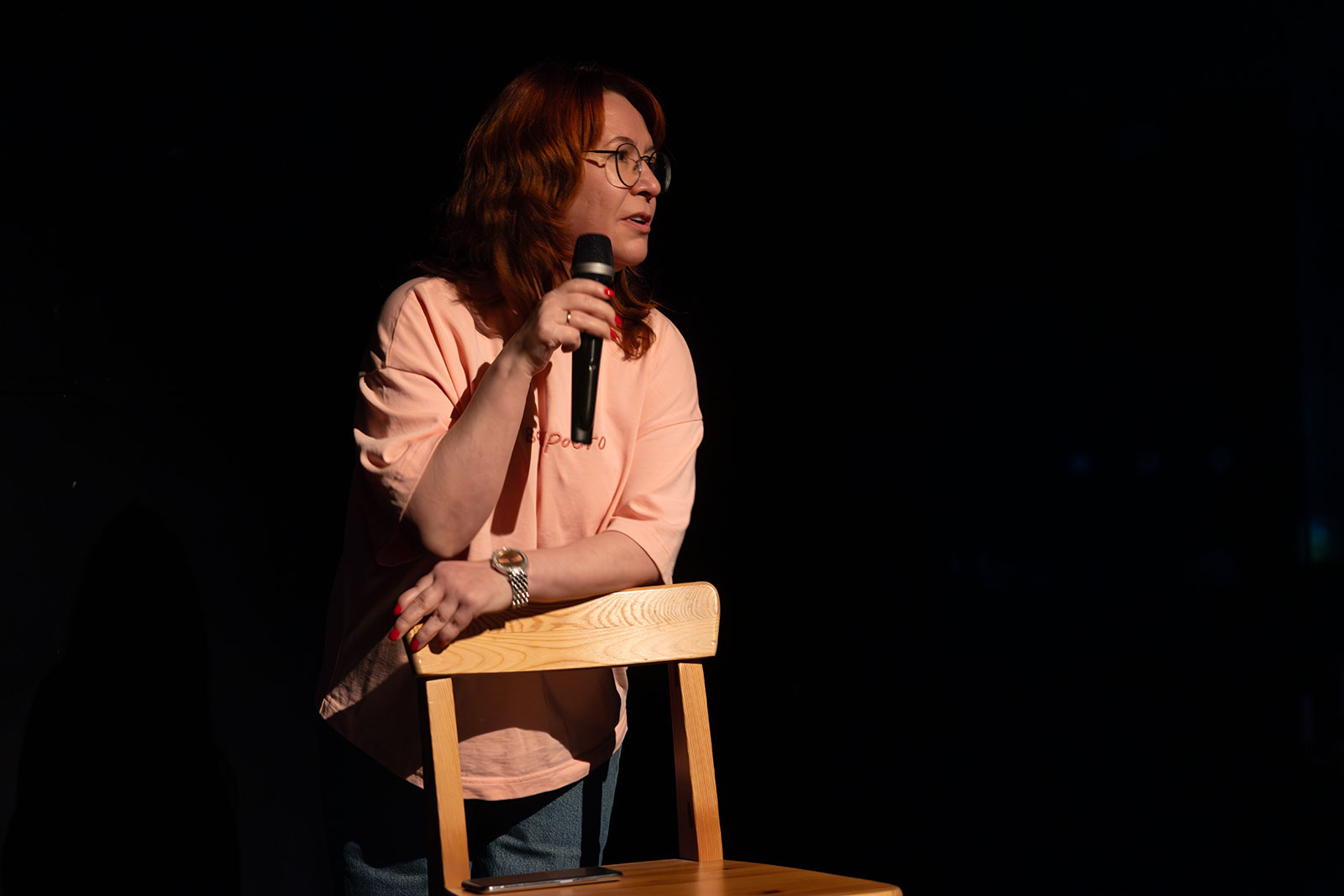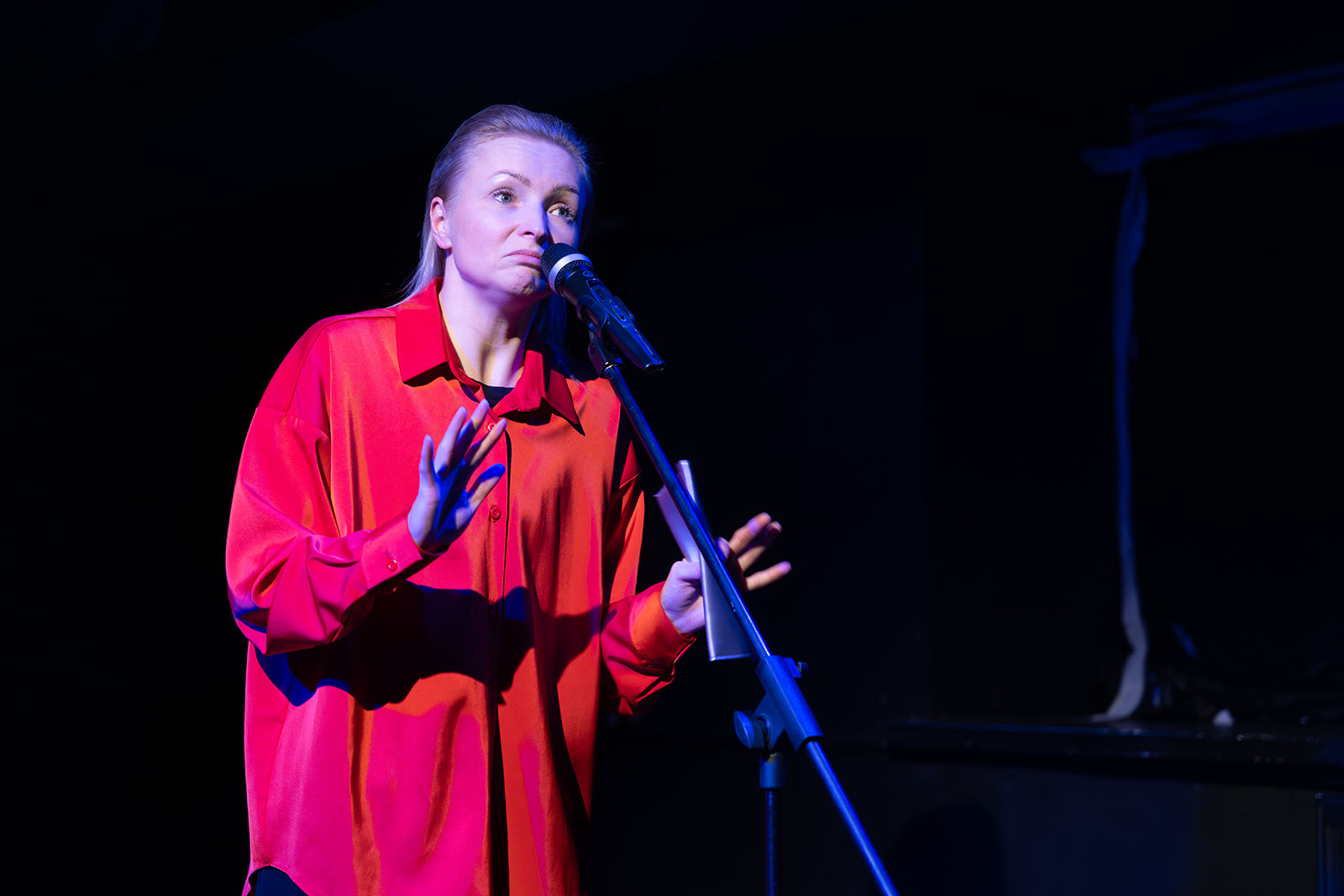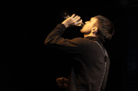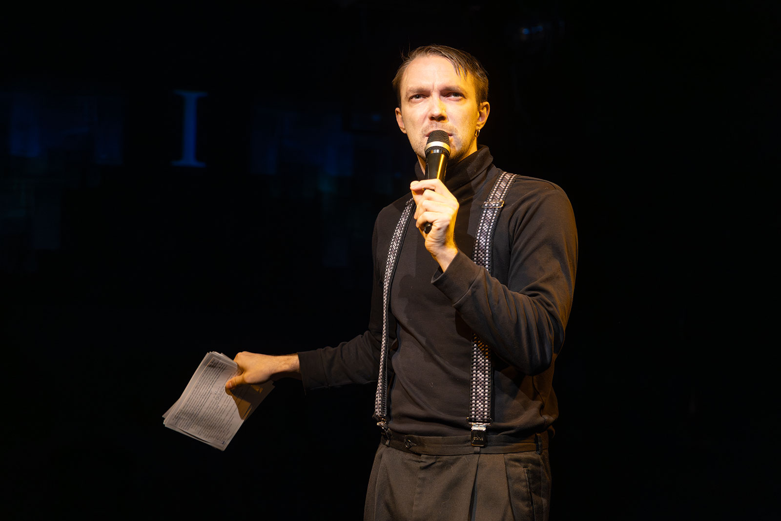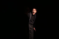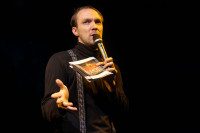 И вот на сцене современный Мерсо в исполнении Глеба Германова. Прилизанная по-чистоплюйски слащавая прическа. Герой-стендапер самоуверенно, не всегда четко рассказывает свои истории. Все сказанное на публику он априори считает шедевром. Он уверен, что каждое описание своего мироощущения — это бесценные слова гениальной автобиографии.