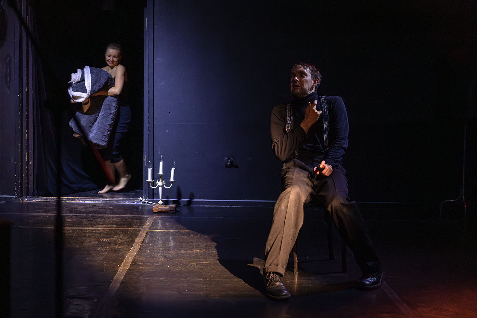 Спектакль поставлен режиссером Кириллом Сбитневым, всего два актера - Людмила Исакова и Глеб Германов.